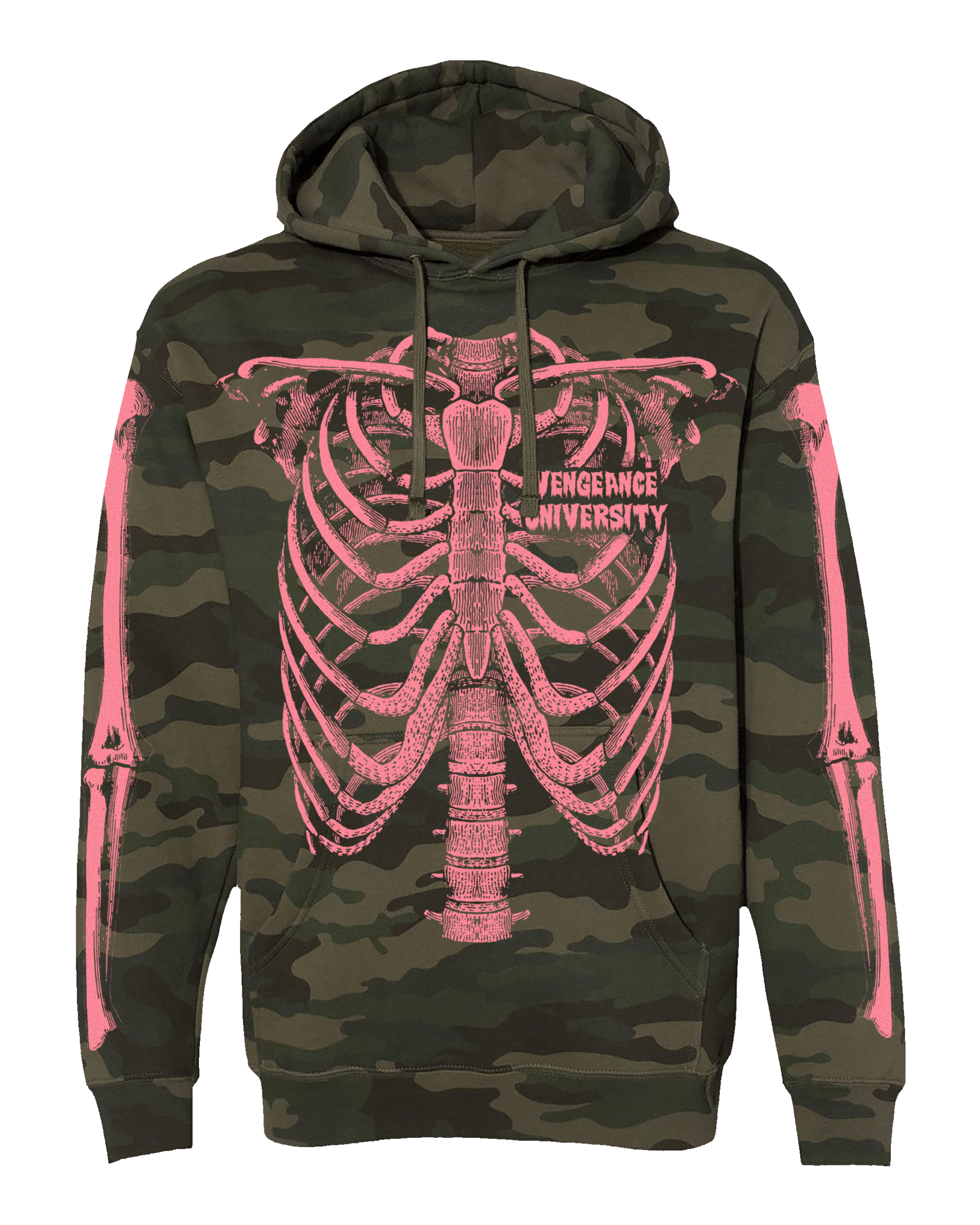 Distressed pink print contrasts against a deep camouflage backdrop, creating a striking visual statement that screams VU attitude.